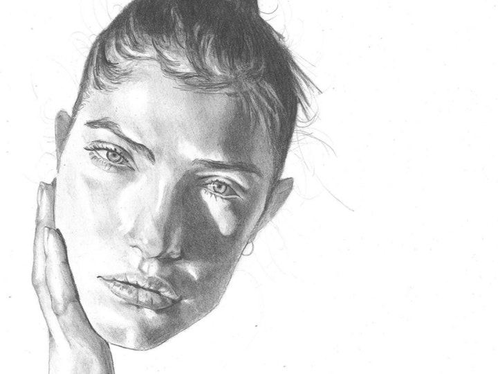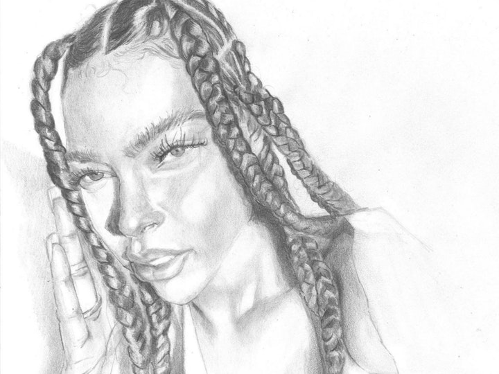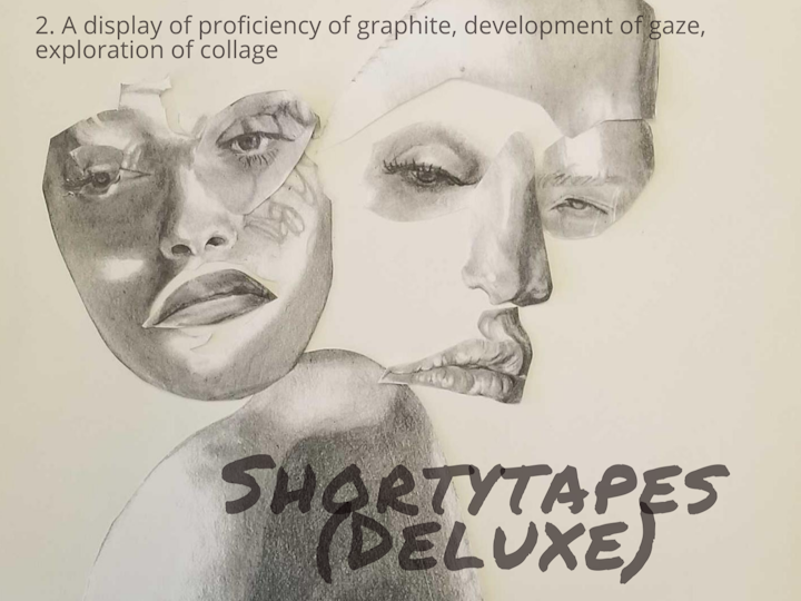 Shortytapes (Deluxe) is a two-volume set that includes graphite portraits, collage caricatures, playlists, and poems. Each graphite portrait has a corresponding poem. The poems serve as the titles of the renderings. Hidden in each poem is a playlist. My intention behind this body of work is threefold. Primarily, I want to illuminate the “best bites” of initial interactions with a woman, who shares a mutual attraction. Those moments inhabit the in-between of a shorty’s perpetual obligation to choose and a shorty’s selection. Secondarily, I want to acknowledge light and it’s interactions with forms on faces. I enjoy accessing the value relationships of interesting forms within an image, referencing those values, softening them, and inserting them into open spaces. Lastly, I seek to dignify beauty in individual features and the nuances in facial expressions. I have always felt compelled to respond to beauty, femininity, and humanity. This body of work temporarily satiates my incessant obligation to respond to all three.